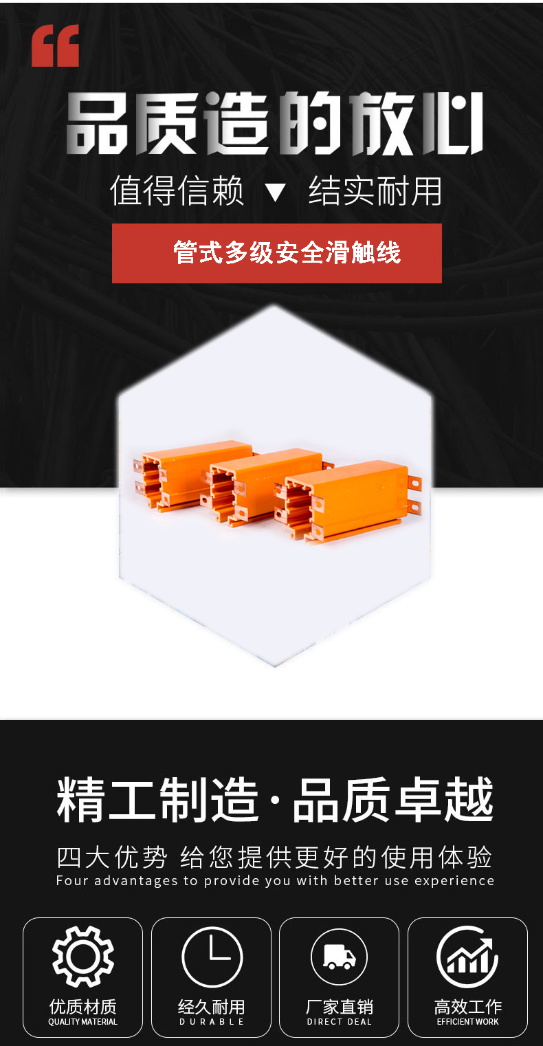 DMHP型管式多極安全滑導(dǎo)線采用高分子聚氯乙烯外殼,內(nèi)嵌多條輸電銅導(dǎo)體作為輸電母線,配置移動靈活的多極電刷集電器,其結(jié)構(gòu)簡單緊湊、安全可靠、安裝維修方便。 由銅代替鋼作為輸電導(dǎo)體,可節(jié)約電能15%~20%,且大大節(jié)省材料和安裝費用。 現(xiàn)泛應(yīng)用于廠礦、庫房、車站、港口碼頭的起重機械,如電動葫蘆、梁式和橋式起重機、電梯、自動化生產(chǎn)線和其它移動的用電設(shè)備.