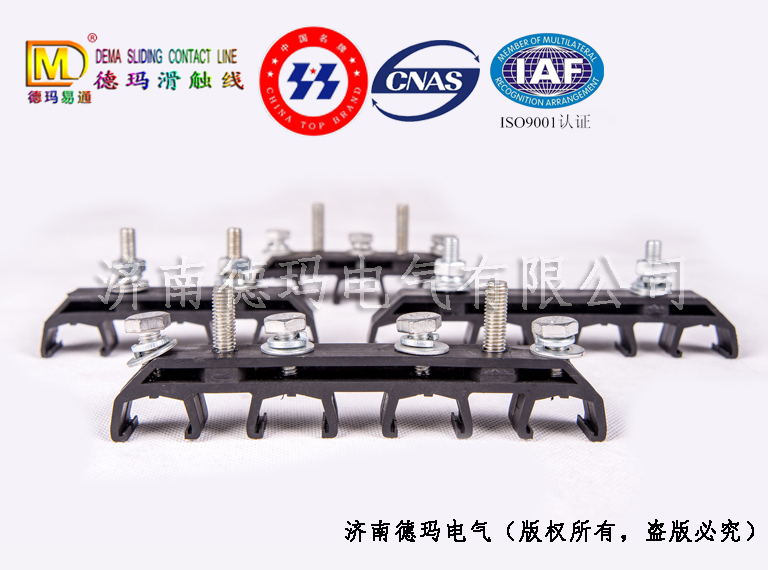 三孔或四孔提掛架又稱懸掛架用來(lái)懸掛輕型滑觸線,每1.5米一個(gè)。提掛架用螺栓與固定在行車軌道上(或墻上)的角鋼支架連接在一起,從而把滑觸線懸掛起來(lái)。其材料為聚甲荃,具有高硬度、抗腐蝕、抗老化的特性,其既能支撐懸掛滑導(dǎo)線,又能在水平、垂直方向固定滑導(dǎo)線。同時(shí)垂直方向可微調(diào),保證滑導(dǎo)線與集電器的緊密聯(lián)結(jié)。提掛夾固定滑導(dǎo)線時(shí)只需與護(hù)套兩邊的吊耳扣合就能輕易地完成安裝,不需任何工具,安裝十分便捷。